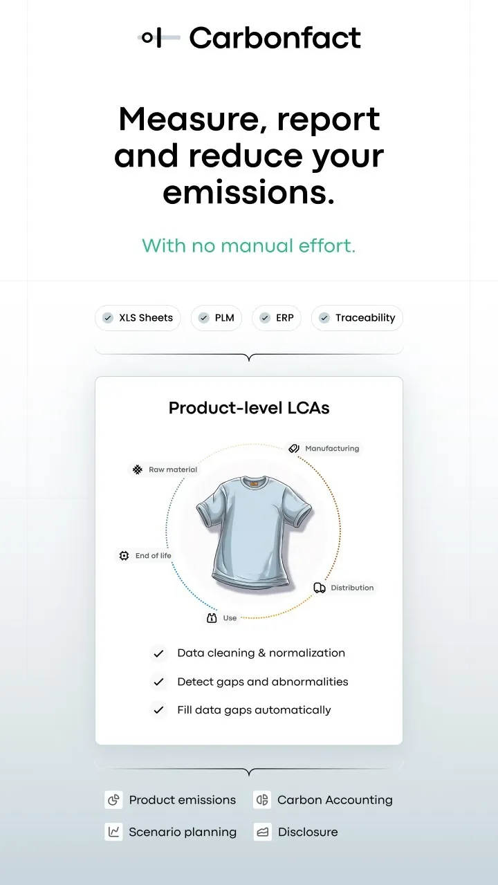 Carbonfact is the only Sustainability Software built for the apparel and footwear industry, helping brands like Columbia, On, and A.P.C., measure, report and reduce their footprint with a team of data experts by their side. By automating complex life cycle assessments, providing data-driven insights, automating environmental reporting, and offering eco-design simulation tools, our software addresses the challenge of opaque supply chains and enables brands to develop effective decarbonization strategies.